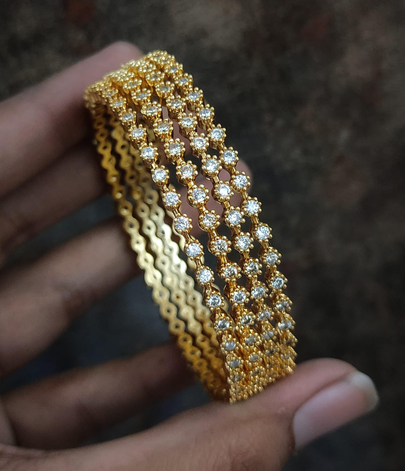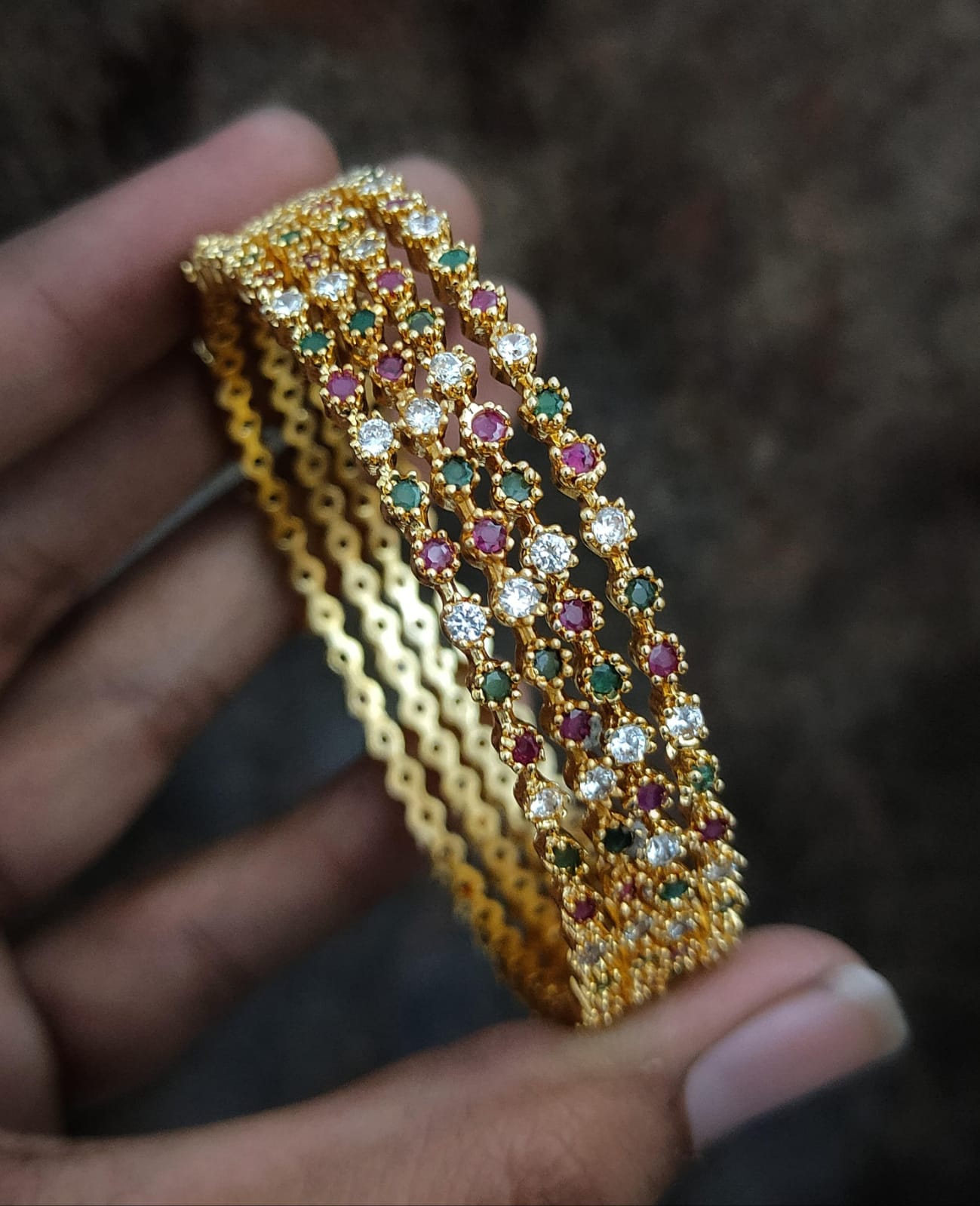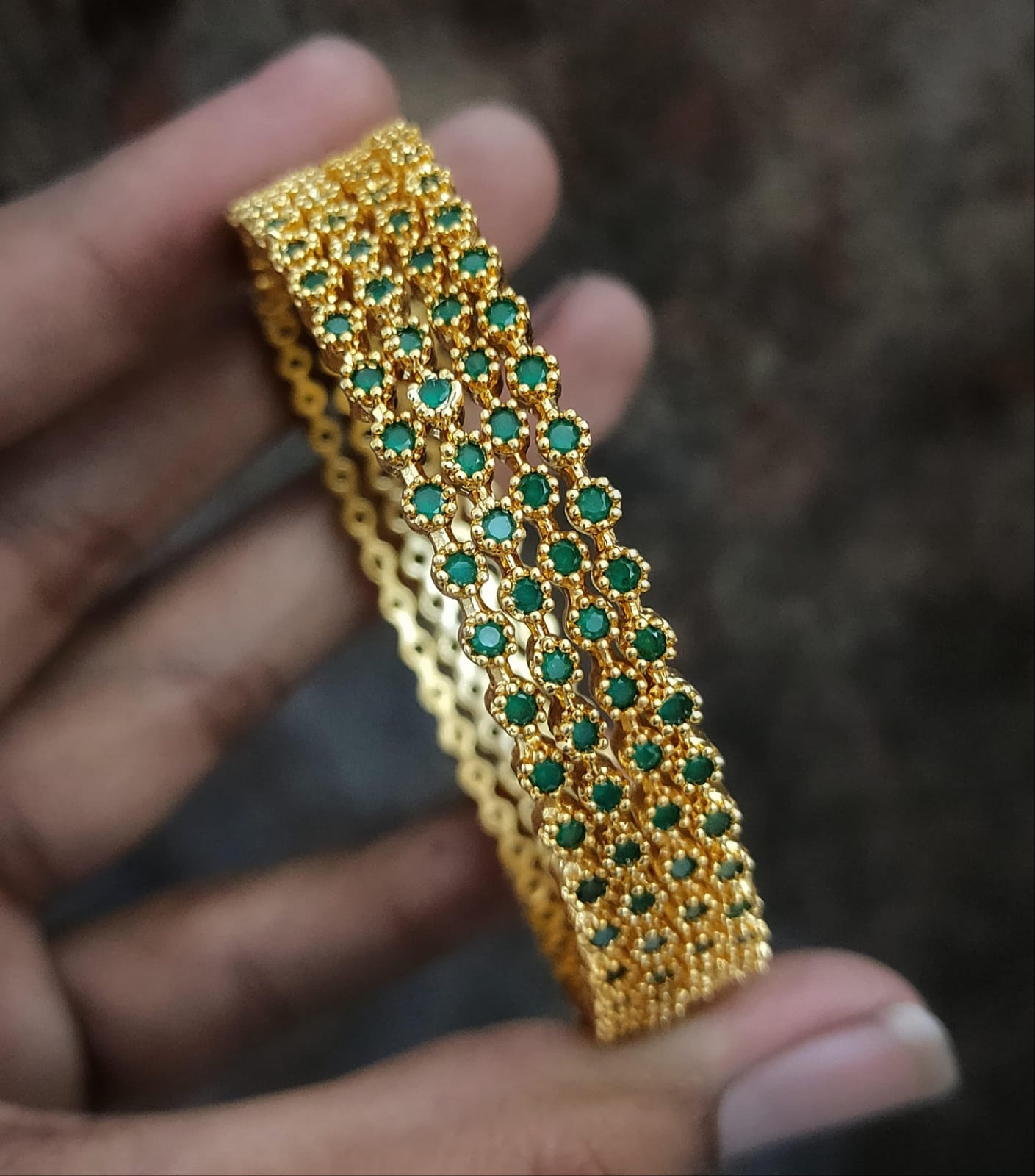 With their tightly set red stones and traditional craftsmanship, these bangles give the feel of heritage gold jewellery. Lightweight yet eye-catching, they’re designed for both comfort and grandeur—ideal for both brides and fashion enthusiasts.