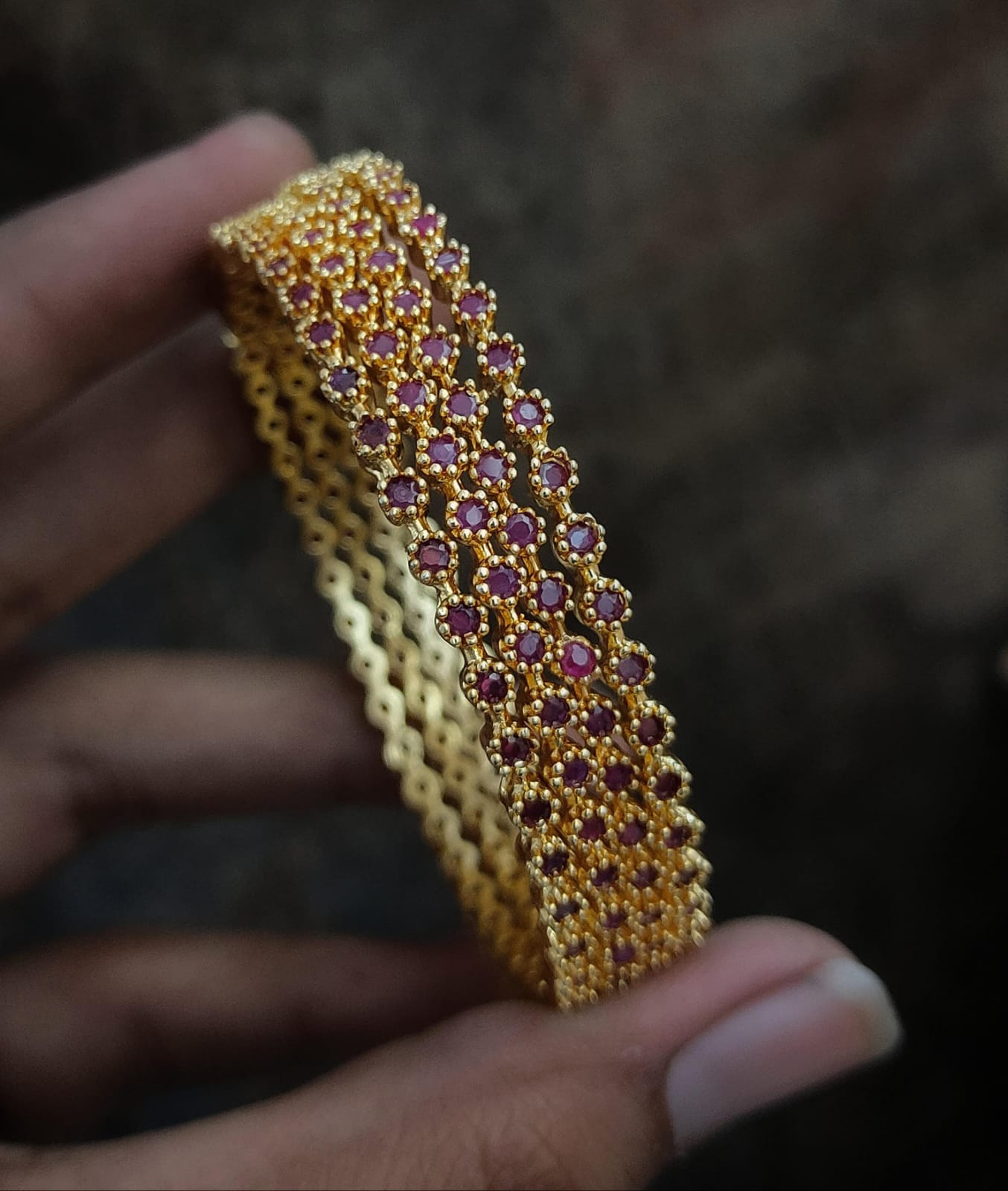 Drape your wrists in timeless beauty with this luxurious set of imitation gold-tone bangles, exquisitely adorned with cluster-set ruby red stones. Designed to evoke traditional elegance with a modern twist, these bangles are a perfect blend of style and sophistication.