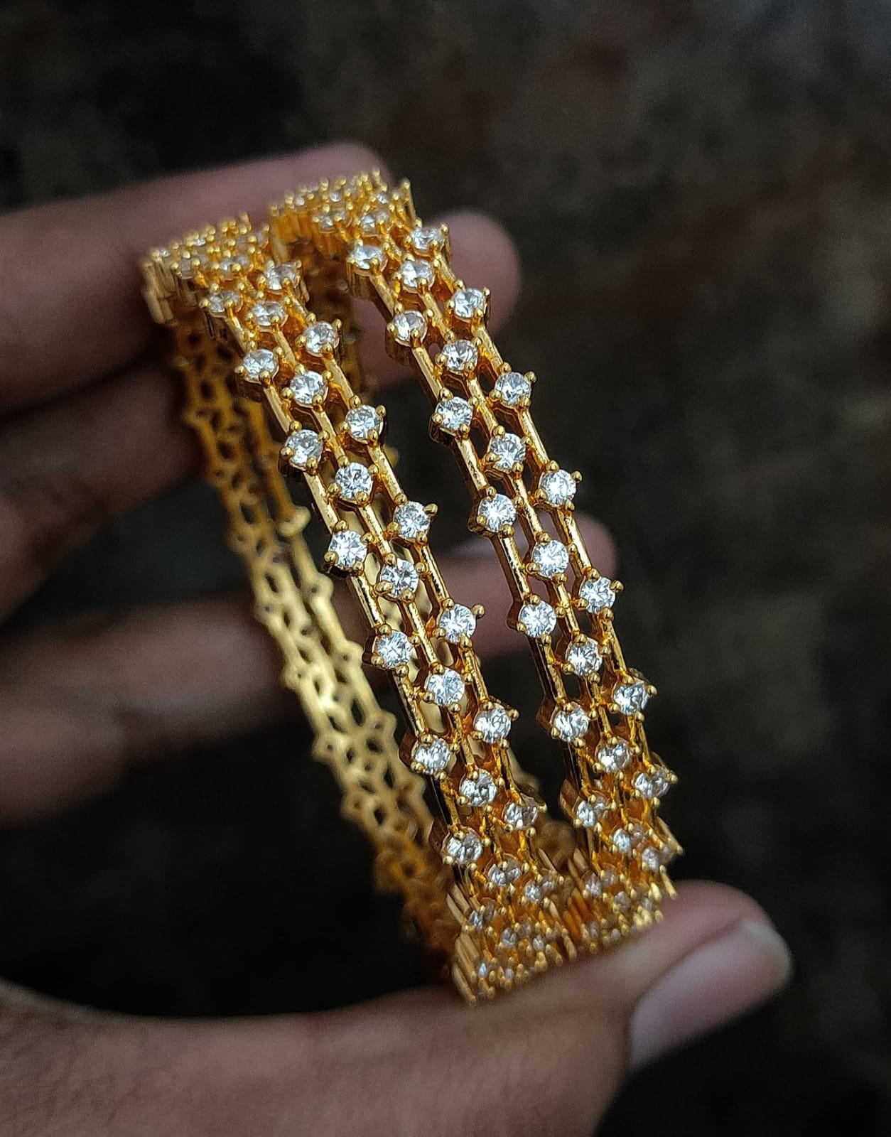 Elevate your festive and party look with this stunning pair of American Diamond bangles. Featuring rows of sparkling white stones intricately set in a golden framework, these bangles offer a rich and radiant appeal perfect for traditional as well as modern outfits.