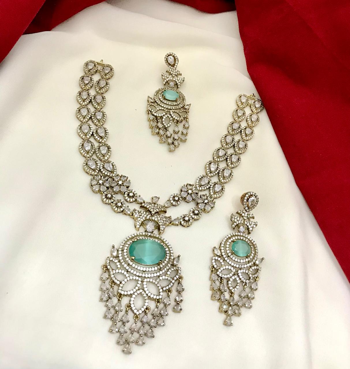 Make a regal statement with this captivating designer necklace set, adorned with shimmering CZ (Cubic Zirconia) stones and a vibrant green gemstone centerpiece. Featuring an intricate teardrop and floral pattern, this necklace set is perfect for bridal wear, festive occasions, and traditional celebrations. The coordinating earrings and maang tikka enhance the overall luxurious appeal, adding grace and glamour to your ethnic ensemble.