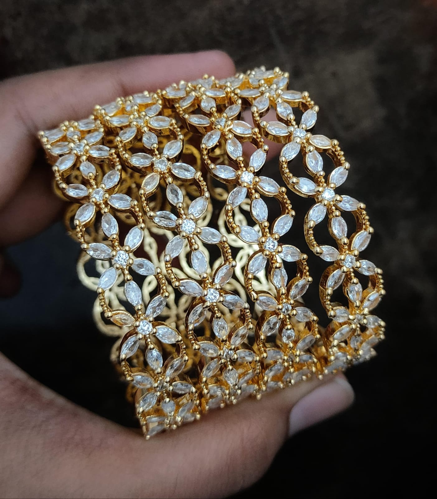 Add timeless elegance to your look with these beautifully crafted floral bangles. Designed with intricate petal motifs studded with sparkling white stones, these bangles reflect a graceful charm that complements both ethnic and Indo-western attire.