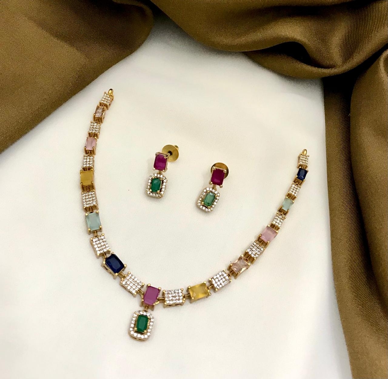 Tags: Multicolor Stone Necklace, CZ Diamond Jewellery, Gold Plated Necklace Set, Party Wear Jewellery, Stylish Imitation Jewellery, Colourful Necklace Set, Trendy Artificial Jewellery Online