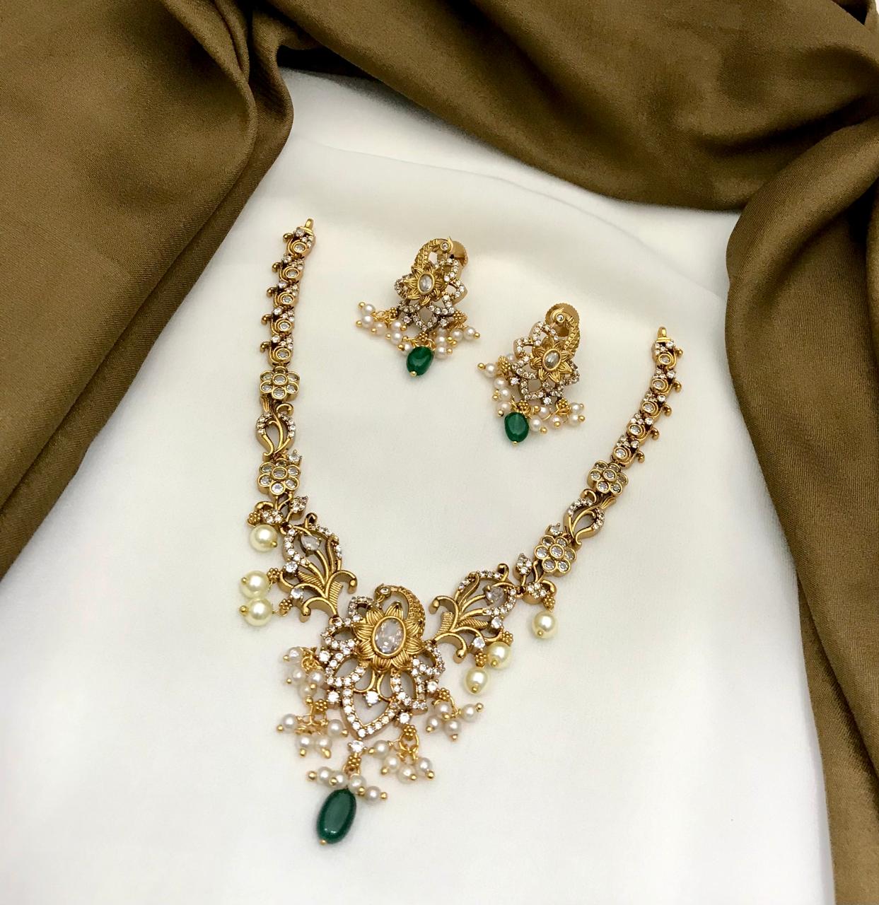 Step into timeless elegance with this beautifully handcrafted gold-toned necklace set, adorned with sparkling stones, lustrous pearls, and elegant green bead drops. The intricate floral and filigree design gives it a rich and regal appeal, perfect for weddings, festive celebrations, and ethnic occasions.